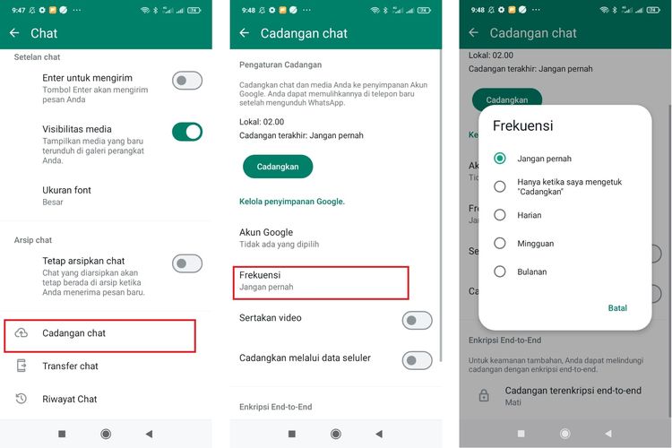 Kenapa ini penting? Kalau kamu milih opsi “Harian” atau “Mingguan”, WhatsApp bakal otomatis backup chat kamu setiap hari atau setiap minggu. Ini emang praktis sih, tapi ya itu tadi, bisa bikin kuota jebol. Mendingan backup manual aja deh, lebih hemat!